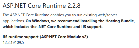 그리고 ASP.NET와 IIS로 호스팅할 웹페이지가 있으시다면 추가적으로 ASP.NET Core Runtime 2.2.8의 Hosting Bundle도